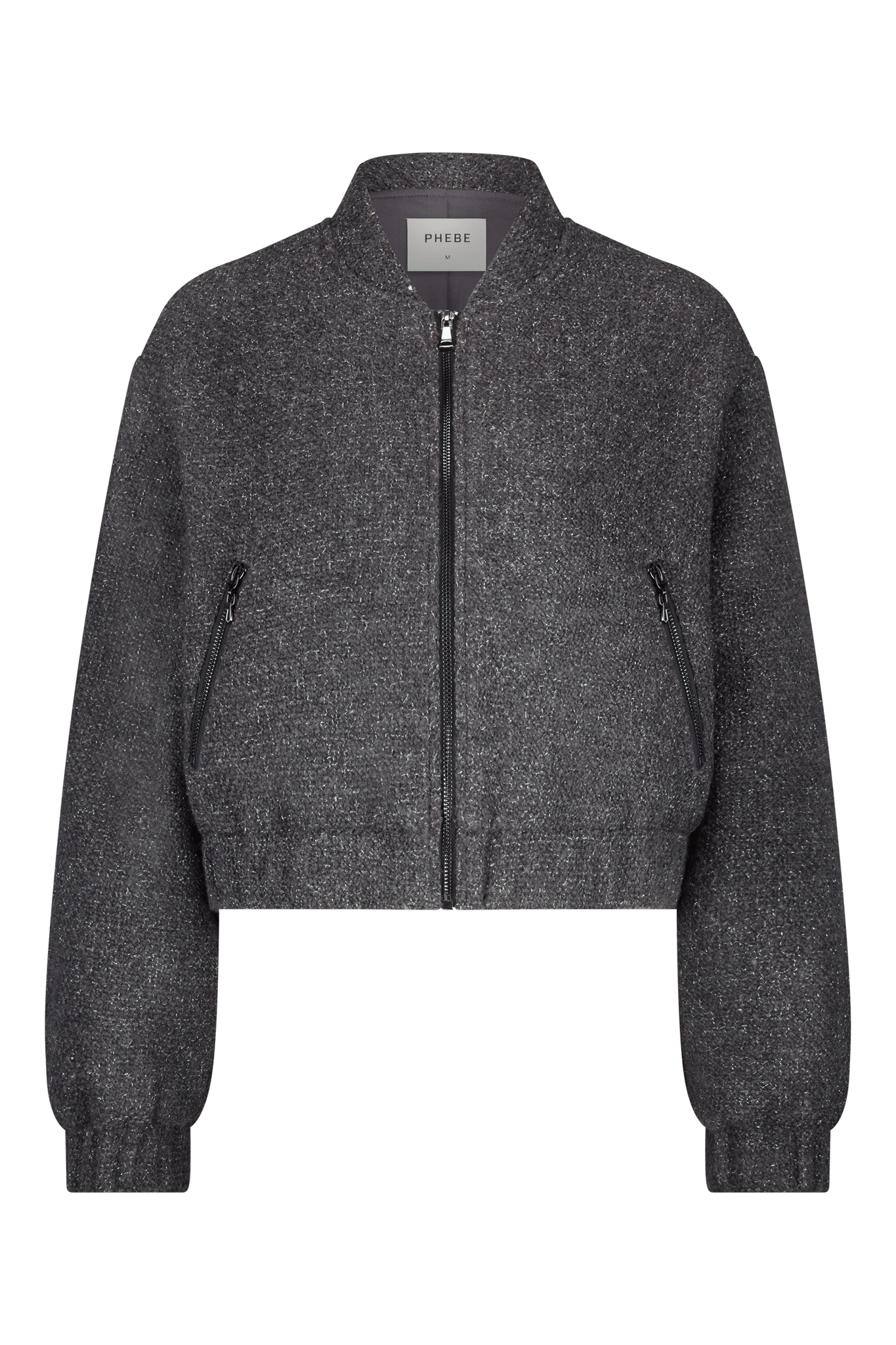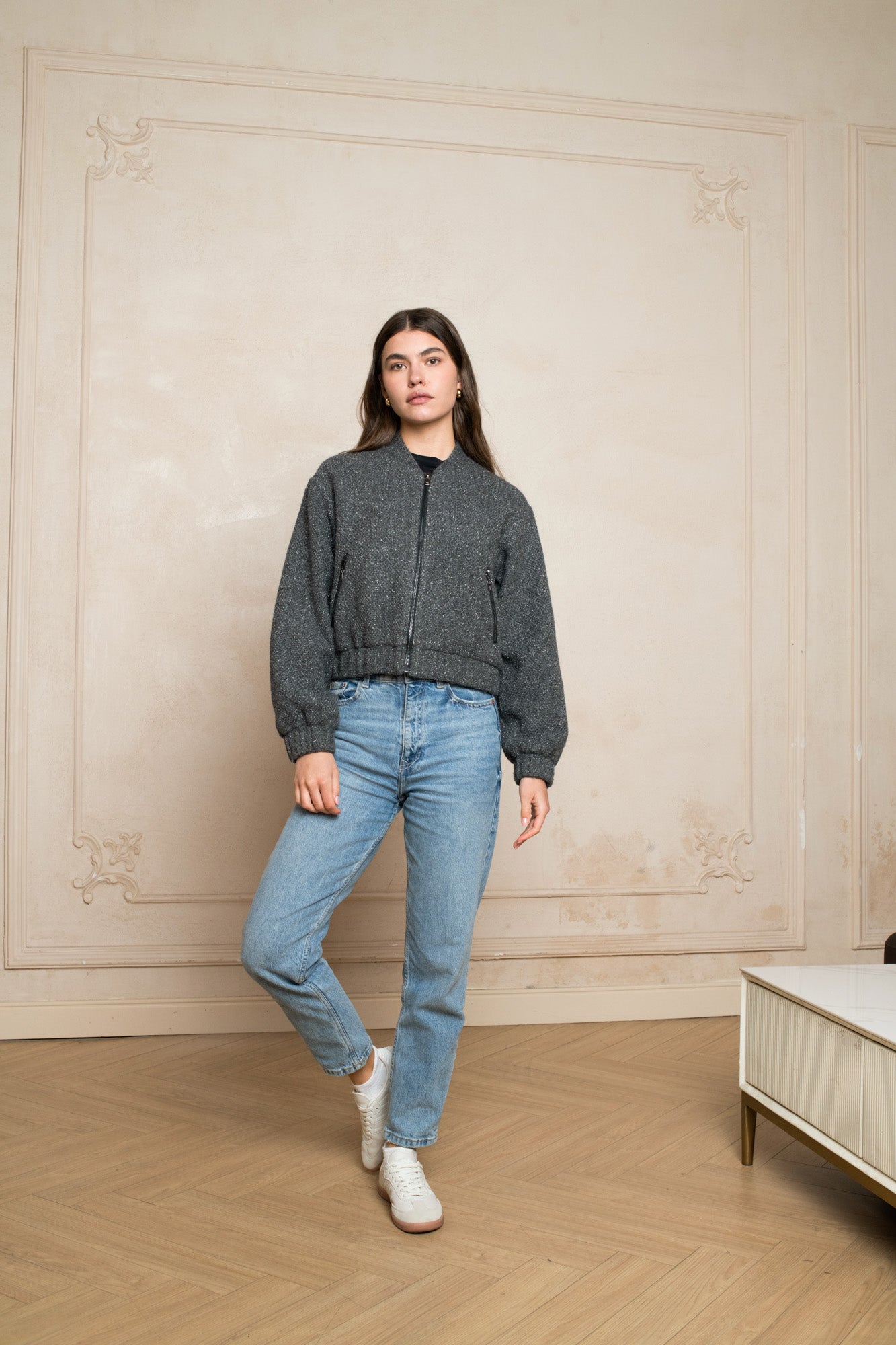 Short jacket in Boucle fabric. No collar, zipper at front, and elastic ribbon on the bottom hem. Gently dropped shoulders, welt front pockets and lined.